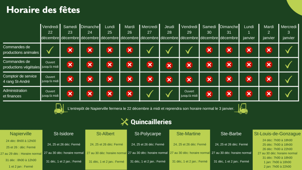 - Le centre de commande de moulée sera ouvert du 27 au 29 décembre. Voir l’horaire pour le centre de commande de moulée.
