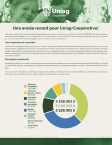 Napierville, le 19 avril 2022 – C’est avec une grande fierté que les membres d’Uniag Coopérative ont voté, en mars dernier, une ristourne historique de 5 286 063 $ lors de leur cinquième assemblée générale annuelle. C’est un défi relevé pour le conseil d’administration, les employés, les membres et les partenaires de l’organisation, qui voient leur travail et dévouement récompensé malgré le climat d’incertitude entourant la pandémie.