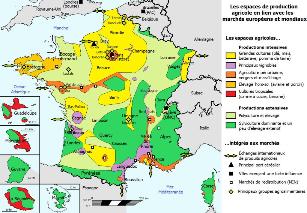 France, even if it is small, is a rich country with a diversity of agricultural productions. From one region to another, the characteristics of the territory influence the choice of productions. Cereals are in the majority (wheat, barley, corn), followed by forage, oilseeds (rapeseed, sunflower), some protein crops (peas, beans). There are also more specific crops such as sugar beet, potatoes or flax and perennial crops with our famous wine regions.