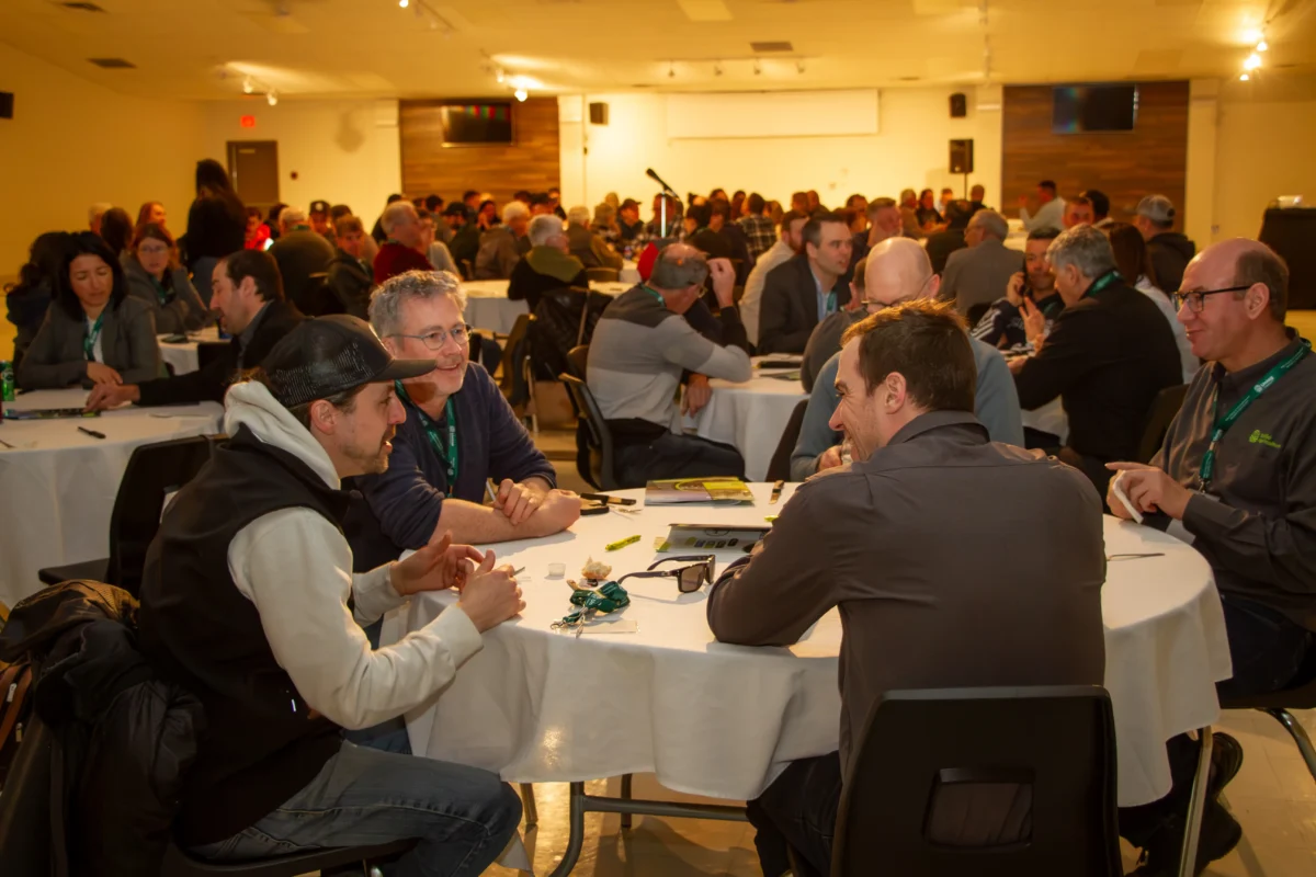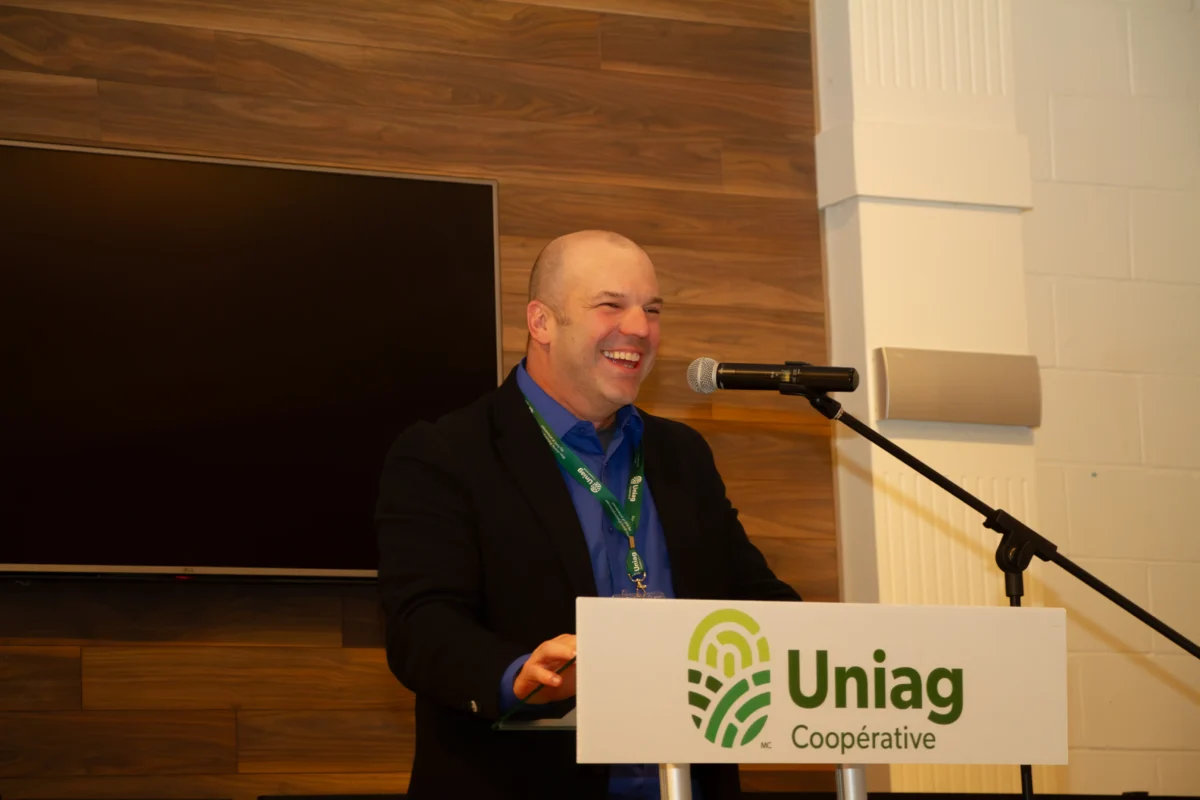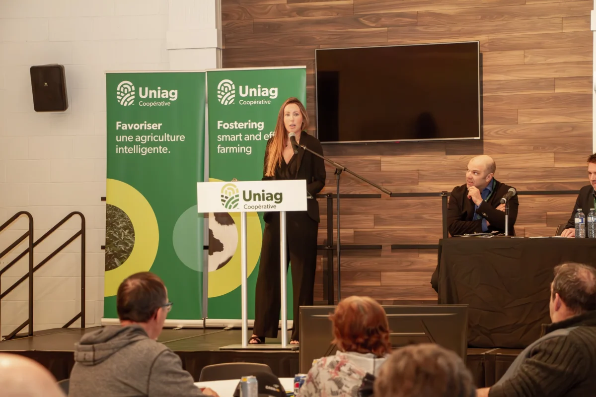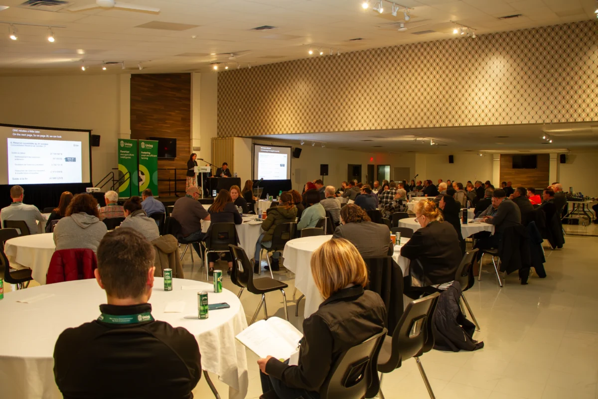Napierville, March 22, 2024 – Uniag Cooperative brought together over a hundred people, including 70 agricultural producers, at its Annual General Meeting on Friday, March 22 at the Saint-Rémi Community Centre. The event was an opportunity for co-op members to discuss the past year’s performance, elect directors and determine surplus distribution. In addition, attendees enjoyed a traditional sugar shack-themed meal, while taking part in discussion workshops on the grain trade and the vegetable sector.