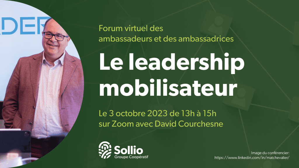 L’événement, qui aura lieu en virtuel, prendra la forme d’un atelier-conférence où des idées pratiques pour incarner une posture de leader mobilisateur sera proposée par notre conférencier invité, David Courchesne. M. Courchesne coache depuis 25 ans différents types de leaders afin de les aider à faire émerger leurs talents et les aider à faire face aux nombreux défis qui les entourent. Son approche, inspirée du modèle GROW, utilise à la fois le plaisir, l’empathie et la générosité rendant ainsi ses coachings pratiques et efficaces. Cet atelier-conférence inspirera les ambassadeurs et les ambassadrices à créer un impact positif et à engager des conversations d’influence mobilisatrice autour d’eux.