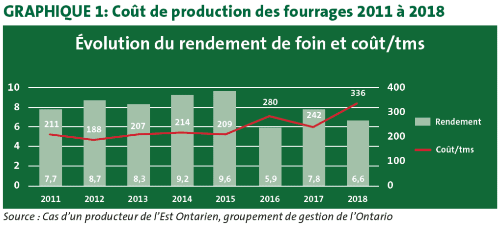 troupeau pour compenser les pertes aux champs. « Le foin est cher » selon plusieurs! En effet, le foin transigé sur le marché au printemps variait de 300 à 400 $/tonne de matière sèche. Certainement plus cher payé que celui de l’an dernier, cependant, lorsqu’on compare à nos coûts de production, est-il si cher que ça ?