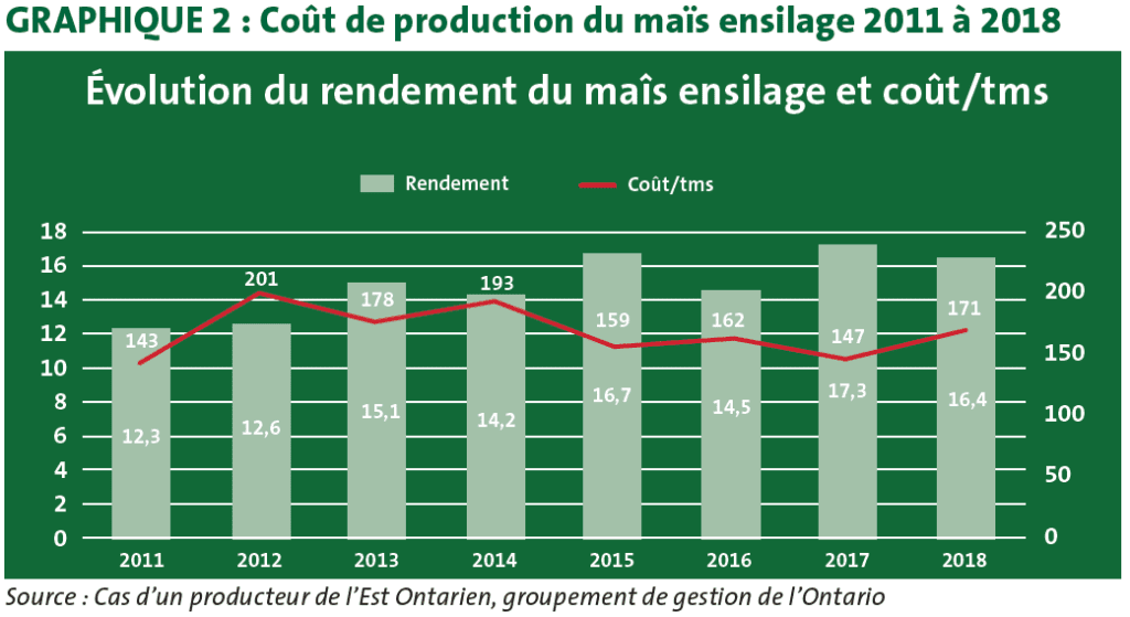 Bien que la luzerne ait eu de la difficulté avec les conditions climatiques des dernières années, cela ne semble pas être le cas pour la culture du maïs ensilage. Cette dernière demeure la plante de dépannage de prédilection grâce à son rendement qui oscille en moyenne à 17 tonnes MS/ha. En observant le graphique 2, nous pouvons constater que le maïs ensilage est une plante qui démontre de la constance dans son rendement malgré les conditions climatiques plus difficiles des dernières années. Par conséquent, les coûts de production ont varié de 147 $ à 170 $/tonne de matière sèche. C’est pourquoi nous voyons une plus grande tendance vers des rations composées à plus de 80 % à base de maïs ensilage puisque son rendement fourrager/ha devient aussi intéressant en alimentation animale qu’il l’est pour votre portefeuille! De plus, lorsque nous considérons le prix des terres de nos régions, il devient plus avantageux d’en tirer le plus grand potentiel en rendement fourrager et utiliser les superficies restantes pour la production de maïs-grain et soya.